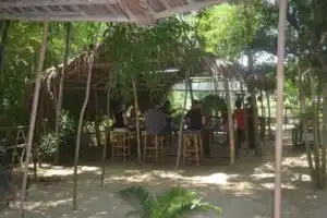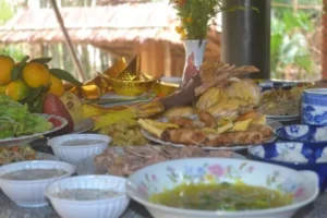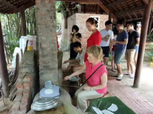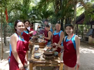 In de tuin beginnen jullie met de kookles. Jullie bereiden verschillende typische gerechten uit de regio, zoals banh xeo (Vietnamese pannenkoek), papajasalade en gegrilde gerechten.